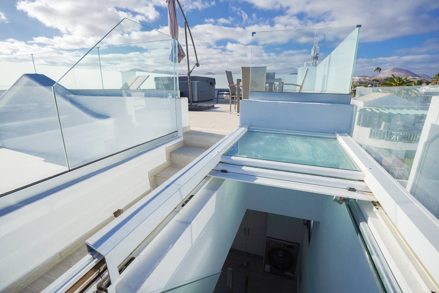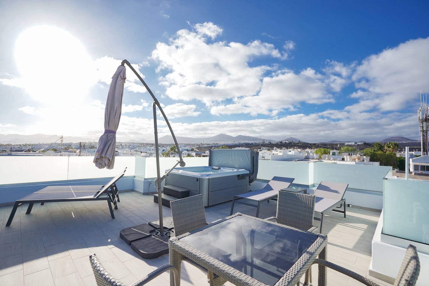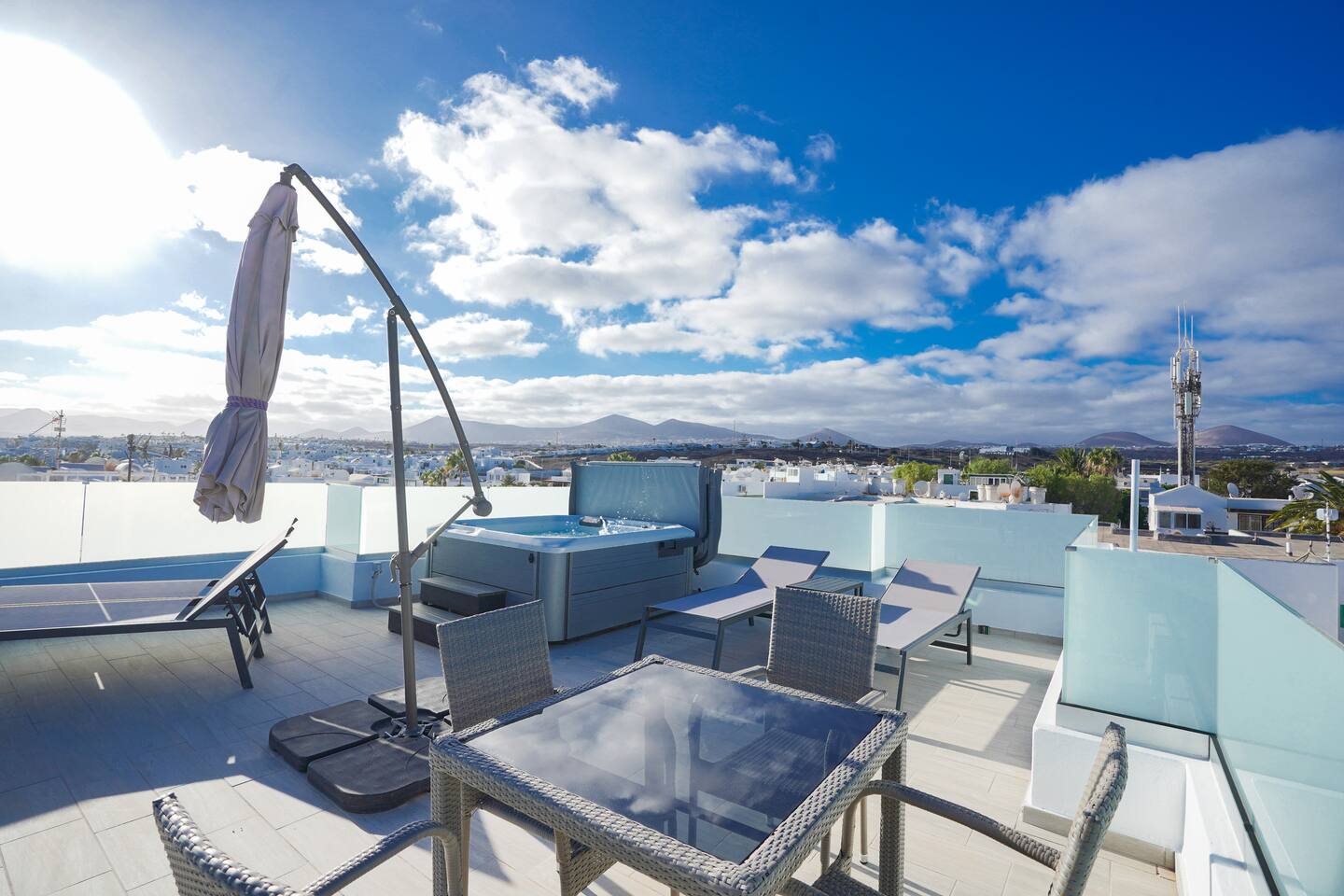 The apartment was easy to find, spotlessly clean and well equipped, located less than 5 minutes from the seafront giving you peace as well as proximity. Parking was easy right outside the door every day. The bedrooms are not particularly spacious but are well thought out so there is plenty of storage, the rest of the interior is similar, compact but made for ease of use, the fittings are all of a high standard and the massive TV made evening movies like being at the cinema! The main draw has to be the rooftop terrace and wonderful hot tub; this area is the same size as the apartment below and does not disappoint! A table and chairs, several loungers, umbrella and a big hot tub which was clean, running and well heated when we got there. We had a bit of an unlucky weather week and the hot tub was really welcome, sunsets and sunrises were spent there, wonderful sea views to the front and mountains to the rear.