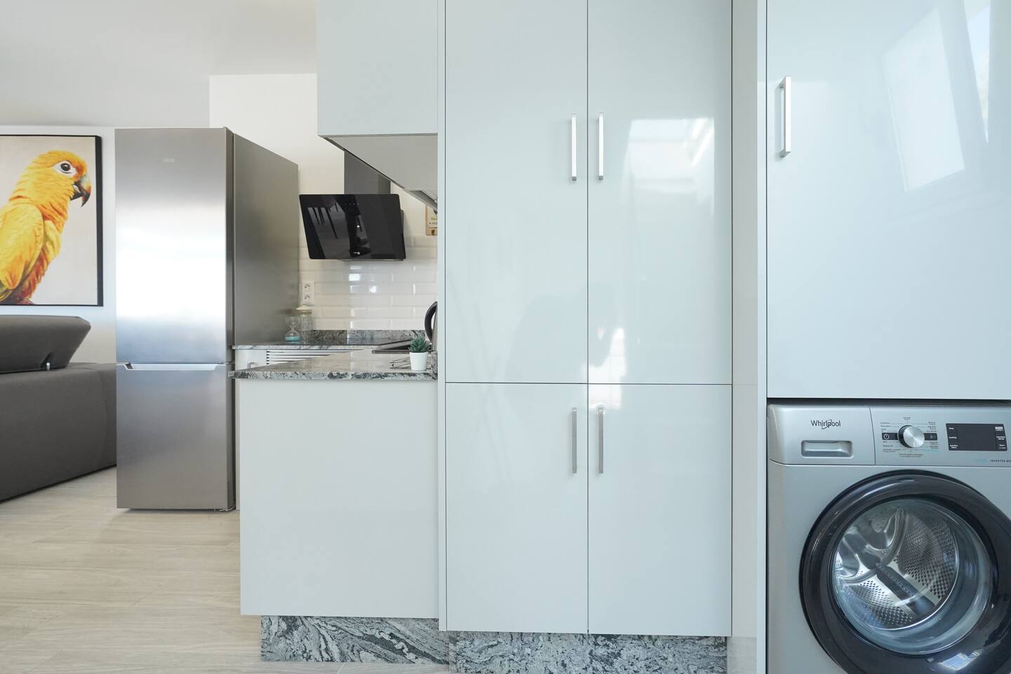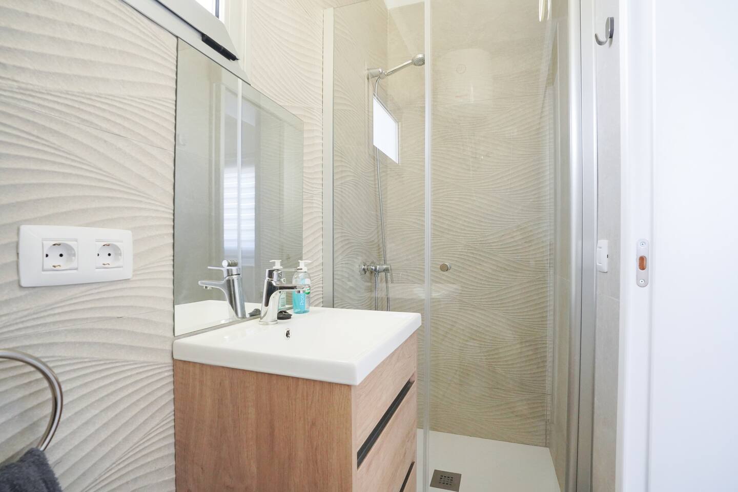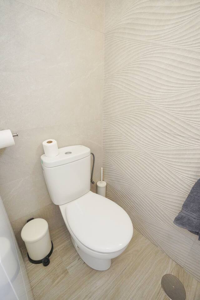 The apartment was easy to find, spotlessly clean and well equipped, located less than 5 minutes from the seafront giving you peace as well as proximity. Parking was easy right outside the door every day. The bedrooms are not particularly spacious but are well thought out so there is plenty of storage, the rest of the interior is similar, compact but made for ease of use, the fittings are all of a high standard and the massive TV made evening movies like being at the cinema! The main draw has to be the rooftop terrace and wonderful hot tub; this area is the same size as the apartment below and does not disappoint! A table and chairs, several loungers, umbrella and a big hot tub which was clean, running and well heated when we got there. We had a bit of an unlucky weather week and the hot tub was really welcome, sunsets and sunrises were spent there, wonderful sea views to the front and mountains to the rear.
